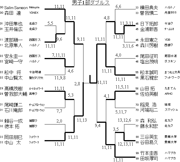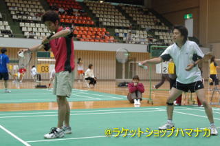 シングルス優勝の国際選手サリムと森田(ヨネックス)のペアーは、頭一つ抜け出た存在だったが、即席ペアーの上、言葉の壁が厚く、1+1=1のダブルスをしてしまった。準決勝で敗退。