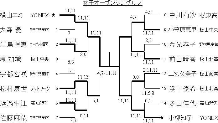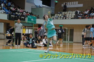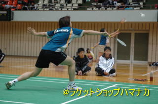 女子オープンの参加者は16名。第1シード横山エミ(YONEX)と第2シード小柳知子(YONEX)中心の展開である。横山ゾーンは、江島(カーピット福岡)、松村(フットワーク)と続けて社会人選手が挑戦したが、横山のうまさに退けられた感じだ。小柳は昨年高校を卒業したばかりのバリバリの若手日本トッププレイヤーの一人だ。ゾーン内にはほぼ同年代の高校生がひしめいていた。高校生にとっては小柳選手に挑戦できる貴重な経験となったに違いない。