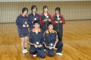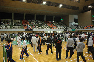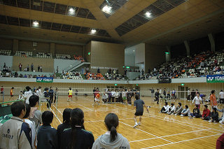 | オープン単準決勝、竹本vs田坂戦のコートの周りは観客が取り囲んだ。松山、愛大で構成される竹本応援団と、新居浜のスマッシュメンバーで構成される田坂応援団だ。 |