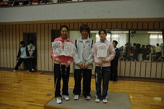 じゃんけんチャンピオンはラケットゲットの上、美女に挟まれて記念撮影。 |