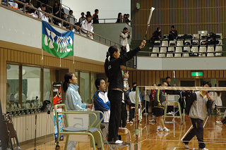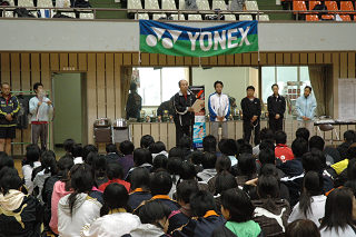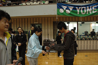 濱島選手からYONEXの新製品NS9900を受け取る松山東高京河選手 |