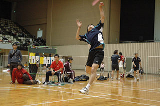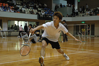 | 男子オープンシングルス準決勝。谷(八万体協)。接戦を勝ち抜き、準決勝ではリズムがよかった。 |