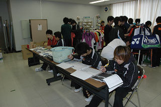 本部後ろで大会の世話をする愛媛大学バド部員とヨネックスブース。 |
