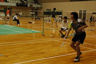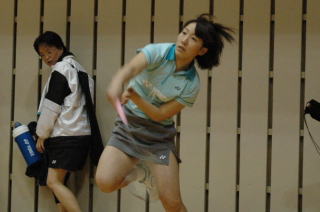 | オープンシングルスはシード選手の除いて抽選で組合せが決まる。だから、シードといっても安心はできない。第1シード横関(ヨネックス)の緒戦は愛媛大学のエース的存在宇津木。最初からフルパワー。 |
