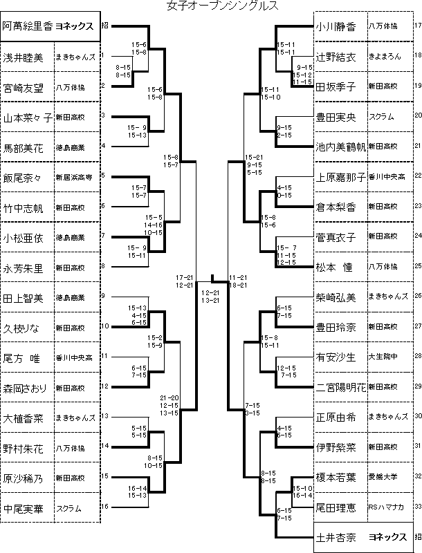 豊田選手(新田高)無難に勝ち上がり、土井(ヨネックス)に挑戦したが、敗れた。ベスト8。 |