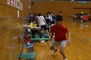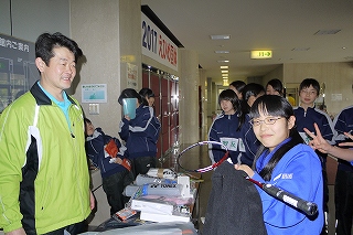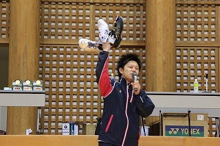 第2会場:オニゴエは休みなく動く。アドバイスは田坂厚司選手(ラケットショップハマナカ・元国体愛媛代表) |
