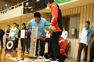 | ヨネックスパワークッションの実験で卵をなげる会場一元気だった高校生。 |