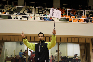 優勝おめでとう。ここでは後ろのポスターにも注目、ヨネックスオープンジャパン開催6月10日〜15日東京体育館。 |