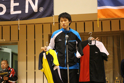 | 気に入ったウエアーがあれば横関選手のダブルス決勝のウエアーとか、三上選手のレッド系のウエアーというように注文できます。 |